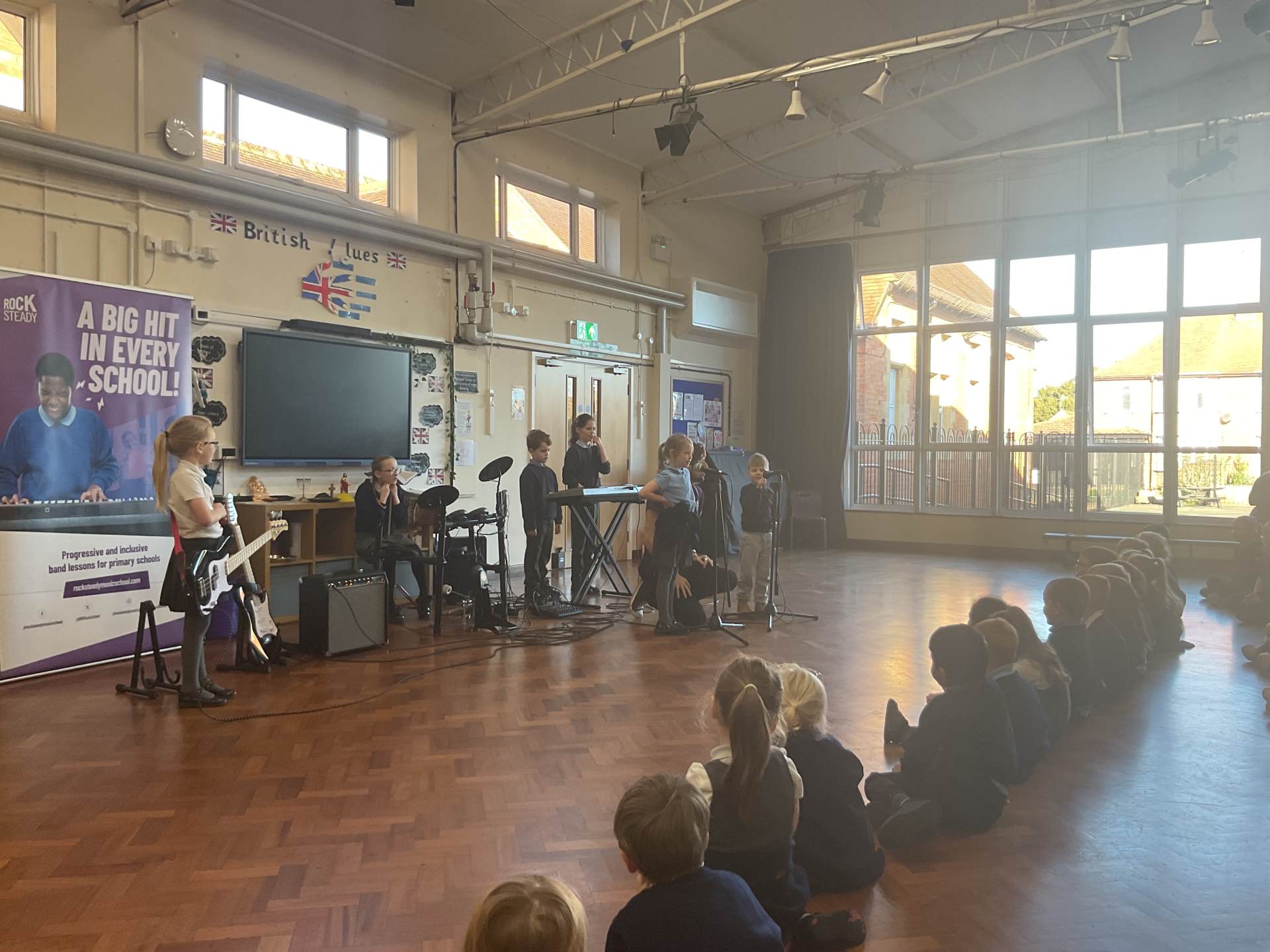 The children enjoyed a brilliant assembly and workshop led by Rock Steady, where they learned about a variety of rock instruments and where they might have heard them. During the workshop, a group of children were selected to play instruments and perform a song to the tune of We Will Rock You, which they did with great enthusiasm. Rock Steady will be offering music lessons for children who wish to learn electric guitar, bass guitar, keyboard, drums, or singing, giving them an exciting opportunity to develop their musical skills.
